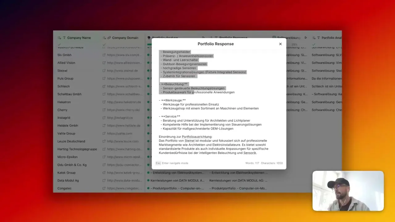Schnelle und skalierbare Anreicherung durch KI: Mithilfe eines gut gewählten Promptings können tausende Unternehmen innerhalb von Minuten, z. B. in ihrer Portfolio-Tiefe analysiert und strukturiert angereichert werden.